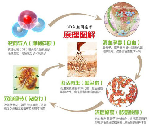 直接作用于脏腑及血液之内,通过刺激机体内的非特异性免疫反应,达到患者自身血液与多种免疫活性物质有序平衡净化;提高血氧饱和度,改善血液循环、调节机体免疫系统,激活细胞免疫细胞代谢,提高提高机体免疫力与人体的组织活性,从而使组织的供氧状况得到改善。多种功效有机结合,靶向治疗,深度修复病灶,促进黑色素细胞再生药物中细胞营养修复因子,刺激黑色素细胞合成细胞生长因子。
